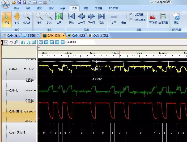通過(guò)圖可以看到,波形在經(jīng)過(guò)中繼器之前,由于總線電容過(guò)大,下降沿變得非常緩,形成了鐮刀狀,這樣就容易導(dǎo)致位采樣錯(cuò)誤。而經(jīng)過(guò)中繼器后,報(bào)文波形經(jīng)過(guò)整形后重新發(fā)出,可以看到波形整體情況良好,能夠保證報(bào)文的正常收發(fā)。